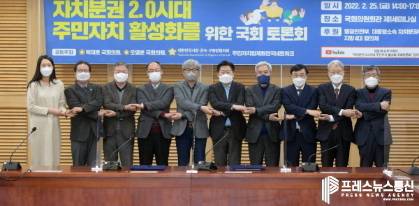[프레스뉴스] 김대일 기자= 자치분권 2.0시대를 대비하여 주민자치의 법제화 방안을 논의하기 위한 토론회가 대한민국시장·군수·구청장협의회(대표회장 곽상욱 오산시장)와 박재호 국회의원, 오영훈 국회의원, 주민자치법제화전국네트워크의 공동 주최로 2월 25일 (금) 오후 2시, 국회의원회관 제1세미나실에서 열렸다.