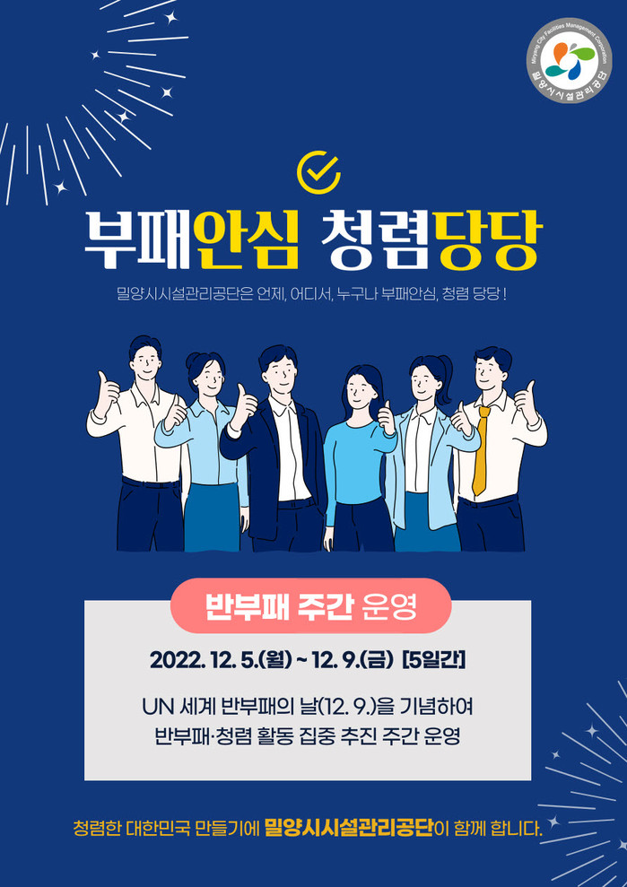 [프레스뉴스] 정재훈 기자= 밀양시 시설관리공단은 세계 반부패의 날(12.9.)을 맞아 오는 9일까지 ‘반부패 주간’을 운영한다고 밝혔다.