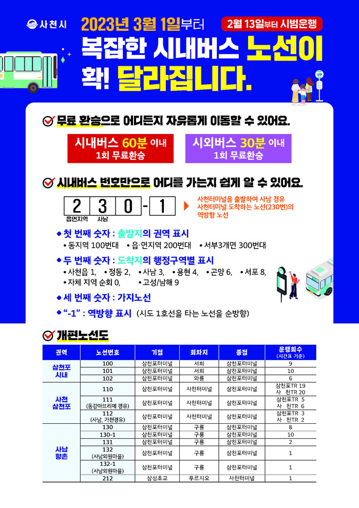 | ▲ 사천시가 3월 1일부터 전면 개편한 시내버스 노선을 본격 시행한다.(사진=사천시) |