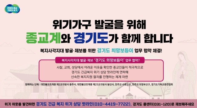 [프레스뉴스] 장현준 기자= 사찰, 교회, 성당같은 종교단체에서도 복지사각지대에 놓인 위기도민 발굴에 함께하기로 했다. 도는 종교단체가 복지사각지대 위기가구를 확인해 경기도 긴급복지 위기 상담 핫라인(010-4419-7722)에 전달하면 신속한 복지 지원을 할 방침이다.