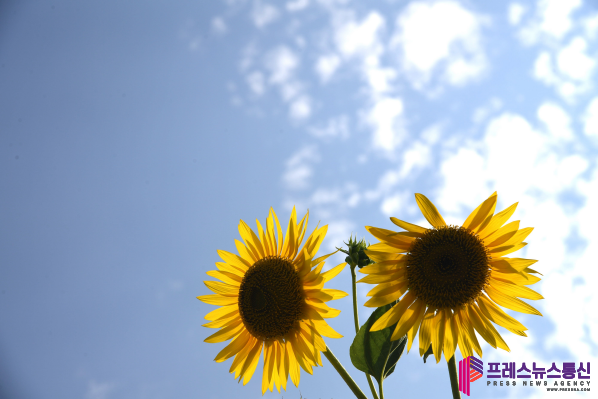 [프레스뉴스] 장현준 기자= 말복을 하루 앞둔 날, 여전한 찜통더위가 기승을 부리는 가운데 활짝 고개를 들어 올린 해바라기가 파란 하늘 아래 선명하게 빛나고 있다.