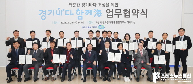 오병권 경기도 행정1부지사와 화성·안산·평택·시흥·김포시 등 연안 5개 시 부시장, 경기주택도시공사 등 경기도 산하 11개 공공기관장은 28일 오후 화성시 전곡항마리나 클럽하우스에서 이런 내용을 담은 ‘경기바다 함께해(海) 추진 업무협약’을 체결했다.