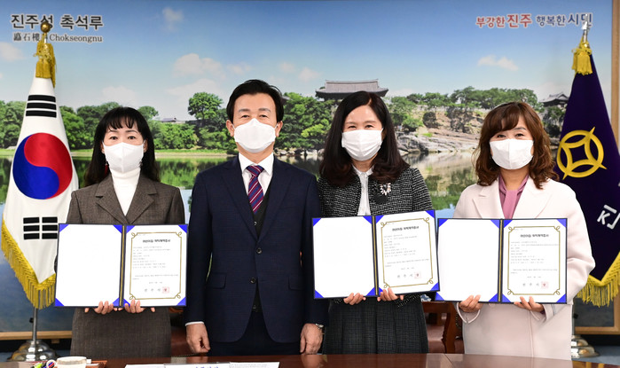 ▲ 진주시는 지난 27일 조규일 시장이 참석한 가운데 국공립어린이집 위탁체 3개소의 위탁 운영자에게 위탁계약증서를 전달했다.(사진=진주시) |