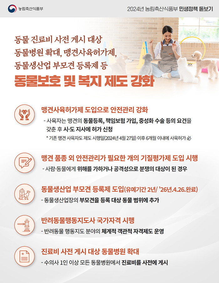 농식품부는 동물 진료비 사전 게시 확대 적용을 차질 없이 추진하는 한편, 맹견 관리, 부모견 등록제, 반려동물행동지도사 자격 등의 내용을 포함한 동물보호법 하위법령 일부개정안을 이달 말 입법예고할 계획이다.