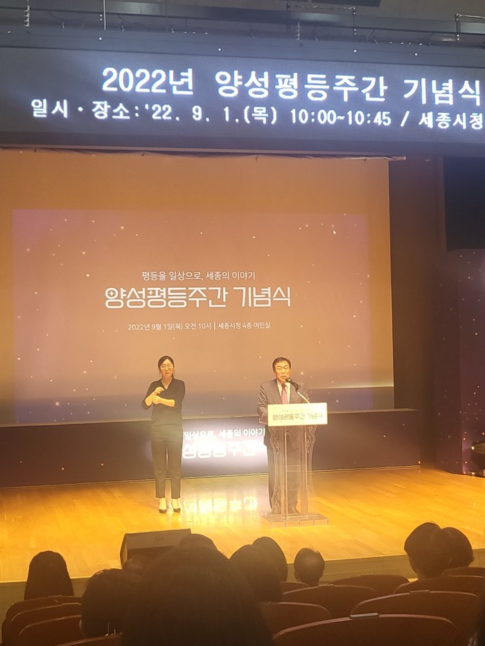 ▲ 최민호 세종시장이 22년 양성평등주간 기념식에 참석해 축사를 하고 있다(사진=김교연기자) |