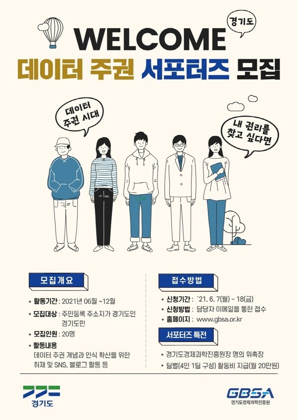 데이터 주권에 대한 관심과 열정 그리고 콘텐츠 제작 및 사회관계망서비스(SNS) 활용 능력 등 지원서 내용을 기준으로 선발하며, 신청은 경기도와 경기도경제과학진흥원 홈페이지에서 공고문을 내려 받아 지원서를 작성한 뒤 담당자 이메일로 제출하면 된다.