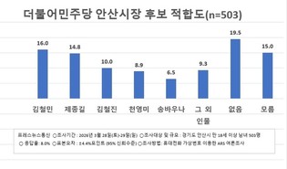 - [프레스뉴스] 강보선 기자= 6·3 지방선거를 앞두고실시한 더불어민주당 안산시장 후보 적합도 여론조사에서 후보 간 지지율이 오차범위 내에서 치열...