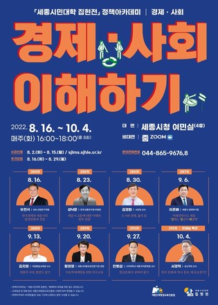 - [프레스뉴스] 임규모 기자=세종시가 ‘2022 정책아카데미’ 네 번째 주제로 ‘경제·사회 이해하기’를 선정하고 오는 16일부터 10월 4일까지 특강을 진행한다.시는 연초 운영계획 수립을 통해 미래·환경 도시 앎·삶 경제·사회 행정·혁신 등 5가지 강의 주제를 선정해 정 ...