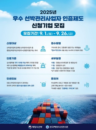 - 해양수산부는 9월 1일부터 26일까지 4주 동안 ‘우수 선박관리사업자 인증’ 신청기업을 모집한다고 밝혔다.'선박관리산업발전법'에 따라 2021년부터 시행하고 있는 우수 선박관리사업자 인증은 우리나라의 선박관리사업자 중 선박관리 역량과 서비스가 우수한 기업 ...
