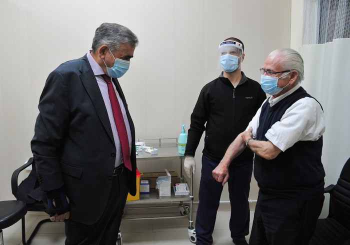 [프레스뉴스] 채정병 특파원=13일(현지시간) 요르단 전역 29개 보건소에서 노인과 의료종사자를 대상으로 코로나19 백신(시노팜, 화이자) 무료접종이 동시에 시작된 가운데 암만 프린스함자병원에서 나디르 오베이다트(왼쪽) 요르단 보건부장관이 접종자와 이야기하고 있다.