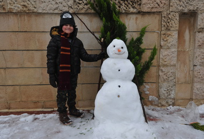 [프레스뉴스] 채정병 특파원=18일(현지시간) 요르단 암만의 주택가에서 한 아이가 자신이 만든 눈사람 옆에서 포즈를 취하고 있다.