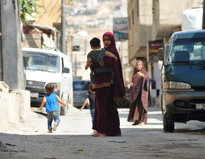 (프레스뉴스)채정병 특파원=14일(현지시간) 요르단 박까아(Baqa'a) 팔레스타인 난민촌 골목에 한 여성이 아이를 안고 카메라를 바라보고 있다.