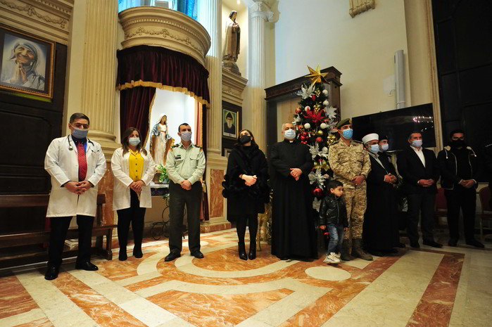 (프레스뉴스)채정병 특파원=6일(현지시간) 요르단 암만의 한 라틴교회에서 열린 크리스마스 트리 점등식 행사에서 의사, 군인, 사회사업가, 이맘(이슬람종교지도자) 등이 참석해 기념촬영을 하고 있다.  요르단 카톨릭 센터는 코로나19 극복을 위해 모두가 하나되자는 취지로 각계각층의 사람들과 함께 행사를 진행했다.