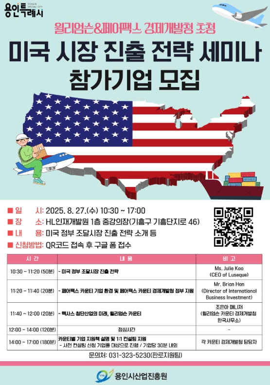 세미나엔 용인특례시가 지난해 자매결연을 맺은 미국 윌리엄슨 카운티, 올해 우호결연을 맺은 페어팩스 카운티 경제개발청 관계자가 참여해 미국 조달 시장 진출 전략과 카운티별 지원 정책을 소개한다.