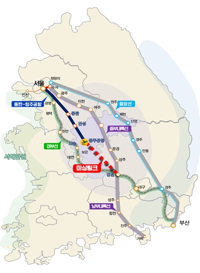 김영환 지사가 취임 초부터 중부내륙 발전을 위해 해소해야 하는 ‘미싱링크’ 구간이라고 강조하는 ‘청주공항~김천’ 철도는 추진 중인 ‘동탄~청주공항(2034년 준공 예정)’과 ‘김천~거제(2030년 준공 예정)’ 및 운행 중인 ‘김천~부산 간 경부고속선’을 중부내륙으로 연결하는 사업이다.