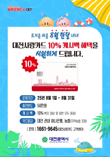 대전시는 8월 한 달간 ‘대전사랑카드'의 캐시백 비율을 기존 7%에서 10%로 확대 지원한다고 30일 밝혔다. 이번 캐시백 확대는 여름 휴가철 소비 비수기를 극복하고, 시민과 소상공인을 응원하기 위한 특별 대책으로 마련됐다.