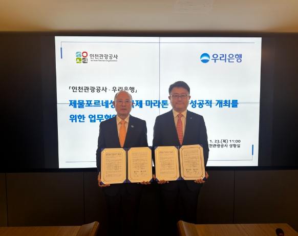 인천관광공사와 우리은행(대표 정진완)은 23일 인천 상상플랫폼에서 '제물포르네상스 국제마라톤대회의 성공적 개최를 위한 업무협약'을 체결했다.