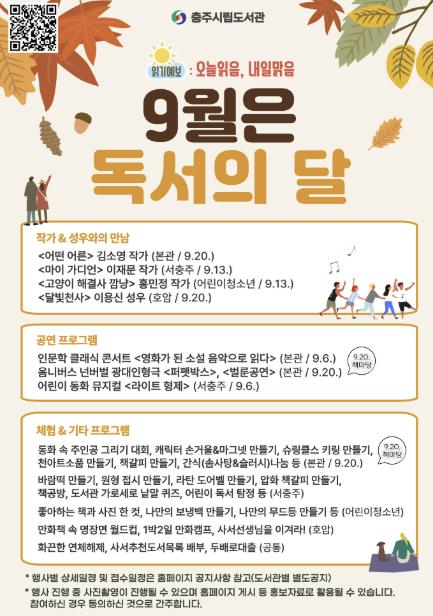 충주시립도서관에서 9월 독서의 달을 맞아 시민들에게 문화 향유 기회를 제공하고 독서의 즐거움을 알리기 위한 다채로운 독서문화 프로그램을 운영한다.