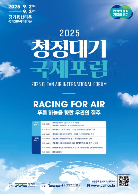 경기도가 9월 2일부터 3일까지 이틀간 광교 경기융합타운(경기신용보증재단 3층)에서 ‘2025 청정대기 국제포럼’을 개최한다. 이 행사는 유엔이 공식 지정한 ‘푸른 하늘의 날’을 맞아 마련됐으며, 동아시아 지방정부, 국제기구, 국내외 환경 전문가와 기업, 학계, 도민 등 약 120명이 참석한다.
