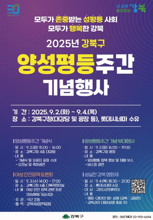 서울 강북구는 양성평등주간(9월 1일~7일)을 맞아 오는 9월 2일부터 9월 4일까지 3일간 강북구청 일대에서 ‘2025년 강북구 양성평등주간 기념행사’를 개최한다.