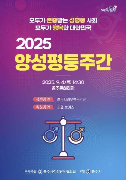 충주시가 ‘양성평등주간’을 맞아 오는 9월 2일부터 4일까지 충주시문화회관에서 양성평등 관련 전시회 및 기념식 등 다채로운 행사를 개최한다.