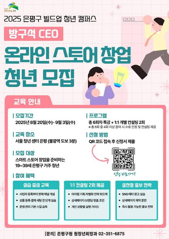 모집은 온라인 스마트스토어 창업을 희망하는 19세~39세 청년을 대상으로 진행되며, 은평구에 거주하는 청년을 우선으로 15명 선정한다. 신청을 희망하면 포스터에 있는 큐알(QR)코드를 통해 접수하면 된다. 프로그램은 내달 10일부터 주 1회 진행된다.