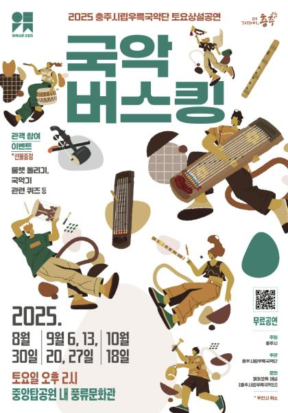 충주시립우륵국악단이 8월 30일부터 10월 18일까지 충주시 중앙탑공원 풍류문화관에서 하반기 토요상설공연 ‘국악버스킹’을 총 6회에 걸쳐 개최한다.