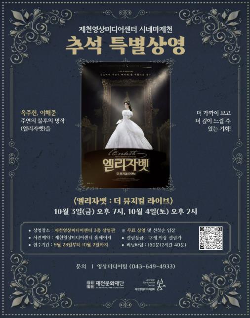 제천문화재단이 추석 연휴 기간인 10월 3일 오후 7시와 10월 4일 오후 2시, 제천영상미디어센터 3층 상영관에서 옥주현 주연의 뮤지컬 공연 실황 영화 '엘리자벳 : 더 뮤지컬 라이브'를 무료 상영한다.