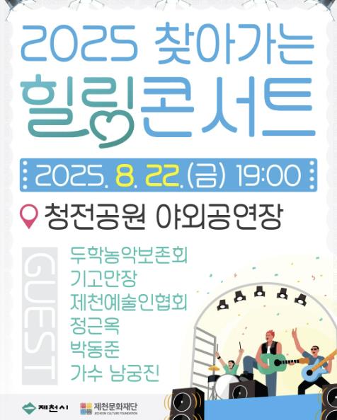 제천시는 오는 8월 22일 저녁 7시, 새롭게 정비를 마친 청전야외공연장에서 2025년 찾아가는 힐링콘서트를 개최한다고 밝혔다.