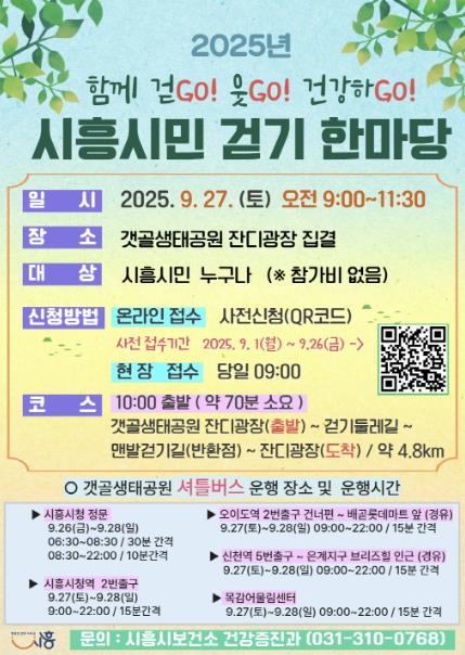 시흥시는 시민의 건강한 생활 습관 확산과 활기찬 지역 공동체 조성을 위해 오는 9월 27일 오전 9시, 갯골생태공원 잔디광장에서 ‘2025년 제3회 시흥시민 걷기 한마당’을 개최한다.
