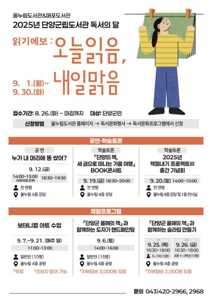 군립도서관은 ▲9월 12일 뮤지컬 '누가 내 머리에 똥 쌌어?' ▲9월 19일 '단양의 책, 세 권으로 떠나는 가을여행' BOOK 콘서트 ▲9월 20일 '2025년 책펴내기 프로젝트Ⅲ' 출간 기념 및 전시회를 비롯해 ▲9월 6일 도자기 핸드페인팅 ▲9월 7∼21일 보태니컬 아트 수업 ▲9월 25∼26일 슬라임 만들기 등 풍성한 프로그램을 준비했다.
