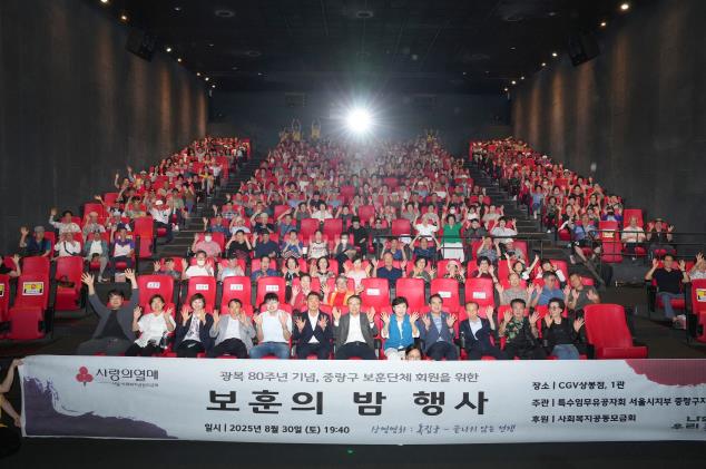중랑구는 광복 80주년을 기념해 지난 8월 30일 CGV 상봉점에서 보훈단체 회원 320여 명을 초청해 ‘보훈의 밤 [보훈단체 영화 관람] 행사’를 개최했다. 이번 행사는 광복의 역사적 의미를 함께 되새기고, 보훈가족에게 감사와 예우를 전하고자 마련됐다.