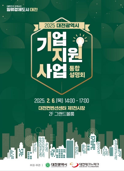 대전시는 오는 6일 오후 2시부터 대전컨벤션센터(DCC) 2층 그랜드볼룸에서‘2025 대전시 기업지원사업 통합 설명회’를 개최한다.