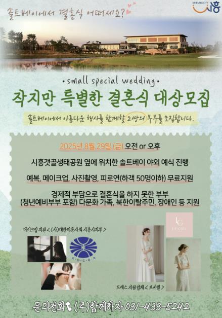신청 기간은 9월 5일까지며, 신청일 기준 시흥시에 6개월 이상 주민등록이 돼 있는 저소득층, 다문화가정, 북한이탈주민, 장애인 예비부부가 해당된다. 예식 장소, 예복, 메이크업, 피로연, 사진 촬영 등 결혼식 전반을 무료로 지원한다.