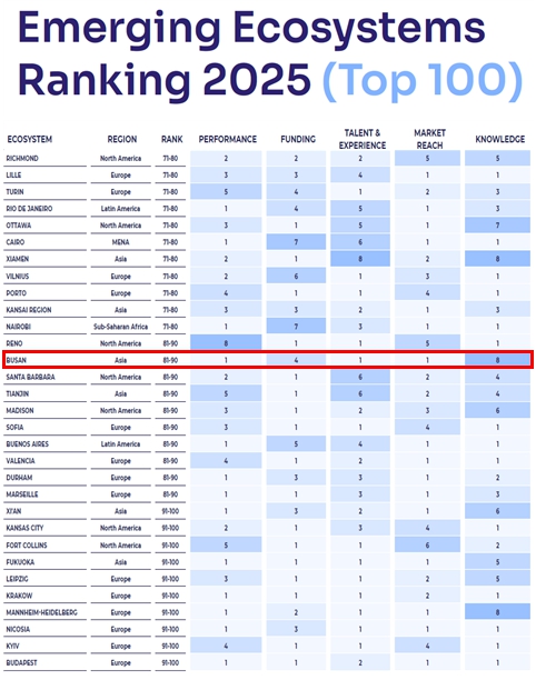▲ 스타트업지놈(StartupGenome)신흥창업도시순위(70~100위) |