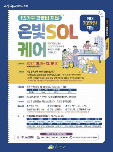 은평구는 입원으로 돌봄이 필요한 1인가구에 최대 70만 원의 간병비를 지원하는 ‘은빛SOL케어’ 사업을 시행한다고 밝혔다.