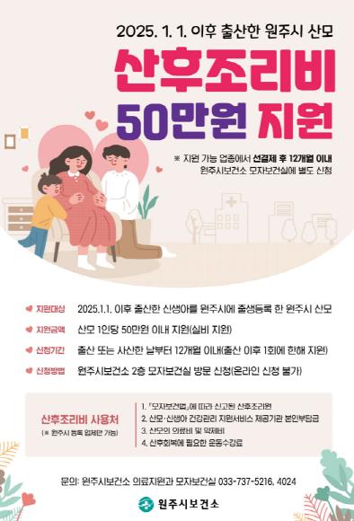 원주시는 2025년부터 출산 또는 사산한 산모의 산후 회복과 경제적 부담을 덜어주기 위해 산후조리비를 지원하고 있다.