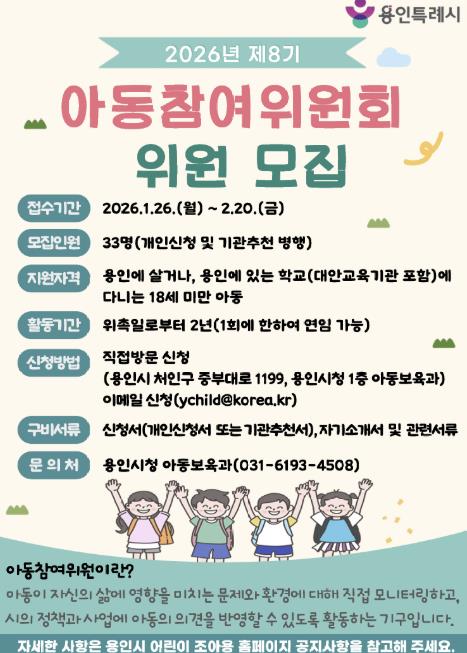 용인특례시는 1월 26일부터 2월 20일까지 아동정책 수립 과정에 적접 참여할 ‘제8기 아동참여위원회‘ 위원 33명을 모집한다.