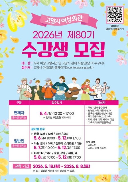 고양특례시 여성회관은 오는 5월 4일부터 12일까지 2026년 제80기 정규강좌 수강생을 모집한다.
