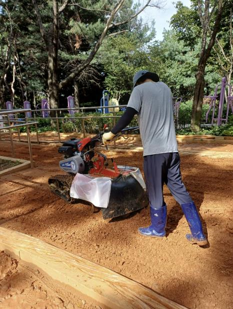 ▲ 성남시 황송공원 내 황톳길에서 로터리 작업(흙 뒤집기)을 진행하고 있다 |
