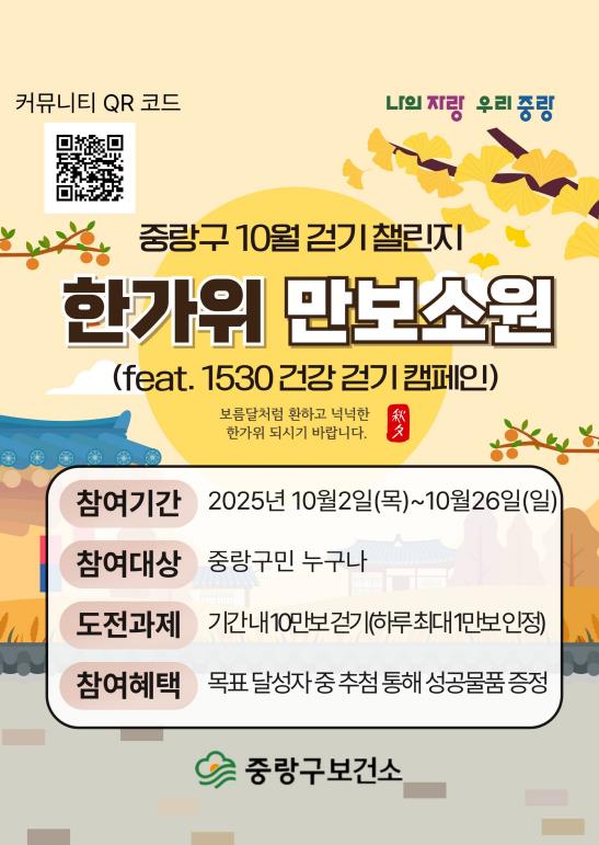 중랑구는 모바일 걷기 앱을 활용한 '온라인 걷기 챌린지'를 10월 2일부터 26일까지 25일간 운영한다. 이번 챌린지는 구민들의 일상 속 걷기 실천율을 높이고, 건강한 생활습관을 유도하기 위해 마련됐다.
