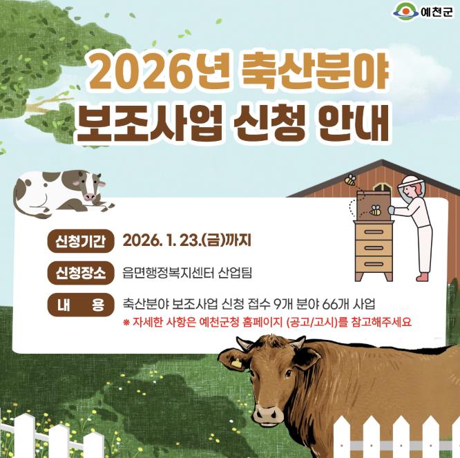 예천군은 2026년도 축산 7개 분야 66여 개의 보조사업에 대해 23일까지 읍‧면 행정복지센터에서 신청을 받는다고 밝혔다.