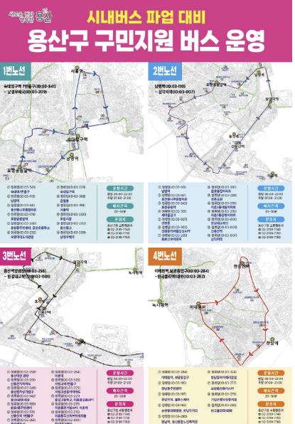 용산구는 시내버스 운행 중단으로 인한 교통 공백을 줄이기 위해 주요 지하철역과 연계한 구민 지원 버스를 운행 중이다. 지원 버스는 용산구 전역을 4개 권역으로 나누어 운영되며, 오전 6시부터 오후 10시까지 권역별로 45인승 전세버스 4대씩, 총 16대가 투입된다.