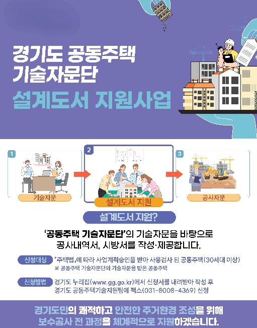 한편 이번 설계도서 지원은 경기도가 아파트의 시공부터 유지보수까지 전 과정을 책임지는 ‘생애주기별 맞춤형 종합 지원서비스’의 하나다. 공사계획 단계에서 1단계 기술자문을 먼저 받은 단지라면 누구나 이 2단계 설계도서 지원을 신청할 수 있으며, 이후 3단계인 공사 품질 확보 자문까지 하나로 이어지는 혜택을 받을 수 있다. 지원을 희망하는 아파트 단지의 입주자대표회의는 경기도 누리집에서 신청서를 내려받아 작성한 뒤 경기도 공동주택기술지원팀에 팩스로 제출하면 된다.