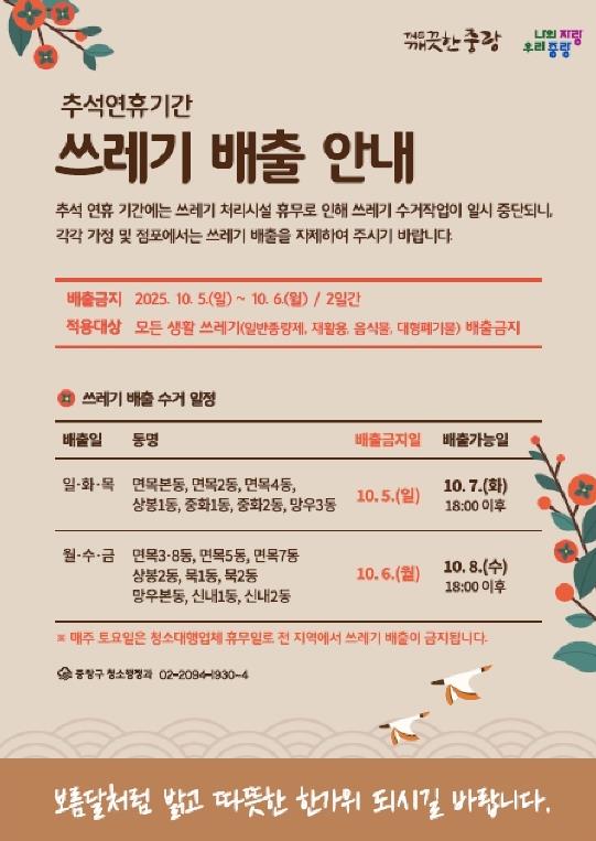 중랑구는 다가오는 추석 연휴인 10월 3일부터 9일까지, 구민들이 건강하고 쾌적한 명절을 보낼 수 있도록 응급의료 서비스와 쓰레기 처리 대책을 동시에 추진한다.