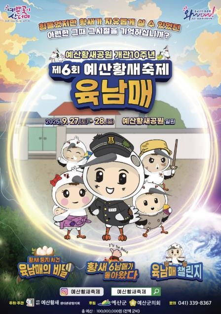 예산군은 제6회 예산황새축제가 오는 9월 27일부터 28일까지 ‘예산으로 돌아온 황새 육남매’라는 주제로 예산군 광시면 예산황새공원 일원에서 열린다고 밝혔다.