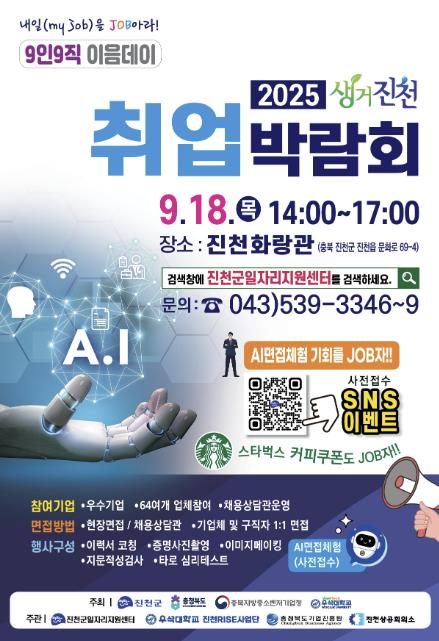 충북 진천군은 오는 18일 오후 2시 군 화랑관에서 300여 개의 다양한 일자리를 제공하는 ‘2025년 생거진천 취업박람회’를 개최한다고 밝혔다.