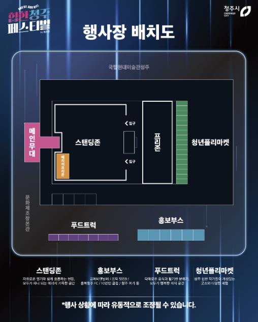 행사 현장에는 충북청주프로축구단, 청주공예비엔날레, 청년뜨락5959, 청주상공회의소, 충북문화재단, 청주시문화산업진흥재단 등 지역 대표 기관의 다양한 홍보부스가 오후 3시부터 저녁 7시 30분까지 운영된다.