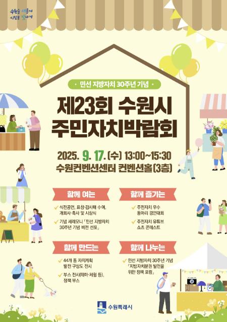 수원시는 9월 17일 오후 1시부터 3시 30분까지 수원컨벤션센터 컨벤션홀에서 ‘제23회 수원시 주민자치박람회’를 연다.