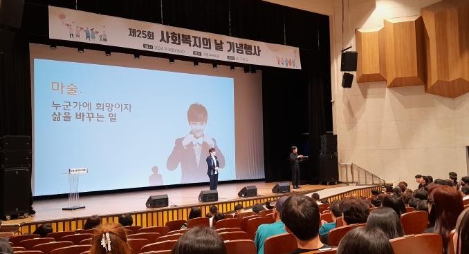 ▲ 제25회 사회복지의 날 기념행사에서 최현우 마술사가 꿈과 희망에 관한 이야기를 나누고 있다. |